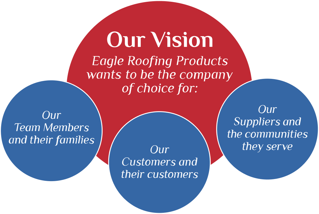 A vision statement expresses what the company wants to create of itself and the world around it. It is a picture of the future. It articulates our culture! It shows every Eagle Team Member in the organization where we want to go, and what we will be like when we get there. Our vision gives shape and direction to our company’s future.